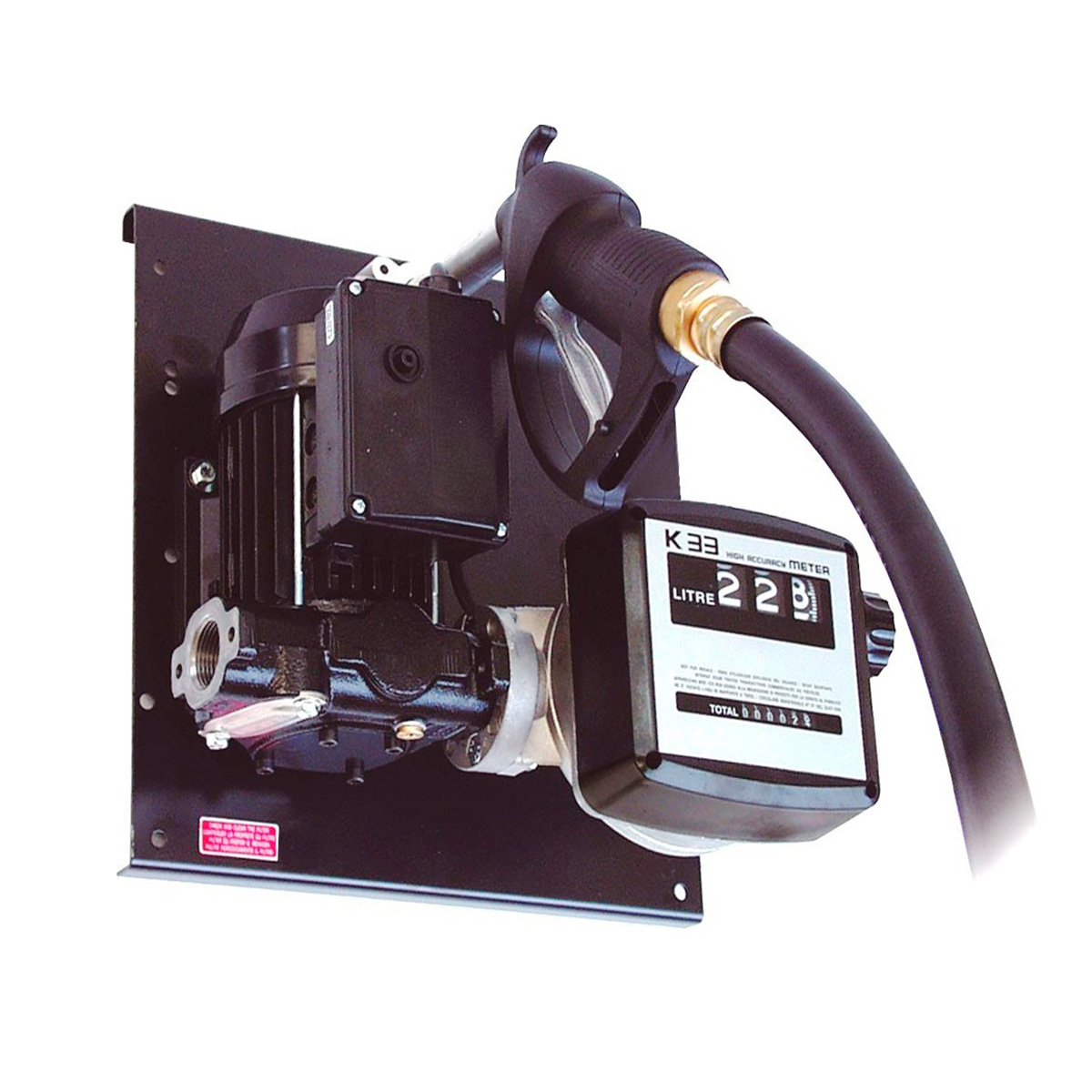 Til vægmontering med indbygget 3-cifret tæller. Leveres med Piusi Panther 56, en 350W lamelpumpe (IP55 beskyttet), 4 m slange med 2 x 1” URG, udløbspistol med autostop som vist på det lille billede ( ikke den SELF 3000, der vises på det store billede), 25 mm tilgangsstuds samt sugefilter/bundventil med 25 mm studs. Giver maks. 56 L/min i frit flow. Indgang i pumpesiden. Udløb i tællersiden.