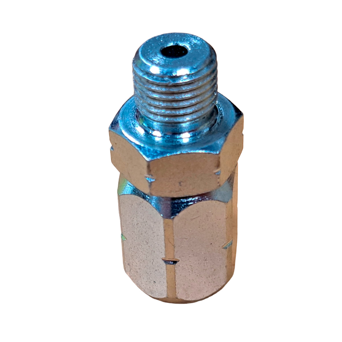 Drejeled til fedtpressere. 400 bar. Fabrikat: Umeta. Indv. + udvendigt gevind (2 x 1/8" RG) Ø 14 mm. Længde 30 mm. Nøglevidde 14 mm.