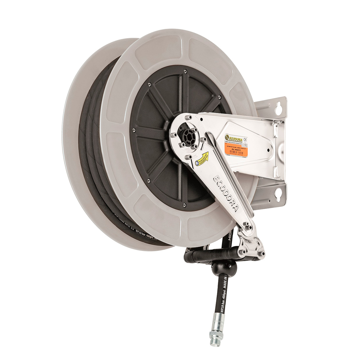 Fabrikat: Ecodora. Rustfri stålramme med ABS-tromle monteret med 18 m 3/8" gummislange med 3/8"RG-afgang. 0,6 m tilgangsslange medfølger (ej vist på billedet). Justerbar afviklevinkel.