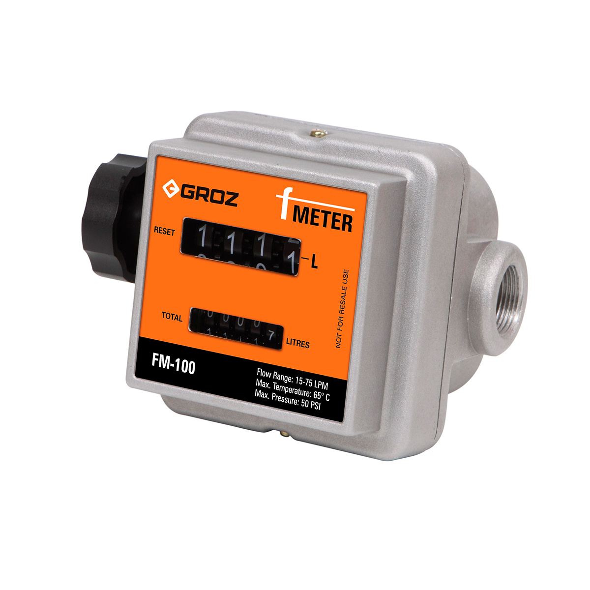 Mekanisk 4-cifret litertæller. Tæller op til 9.999 L. 6-cifret, ikke-nulstilbar totaltæller til 999.999 L. Egnet til flow: mellem 15-75 L/min. Maks. pumpetryk: 3,5 bar. Tilslutninger: 2 X 1" IRG.