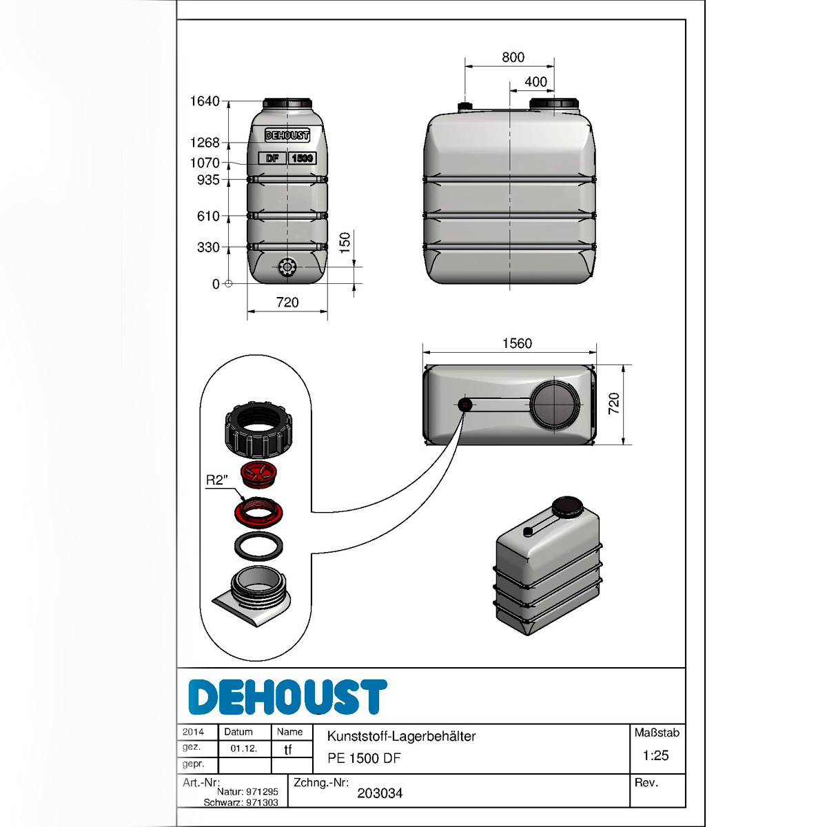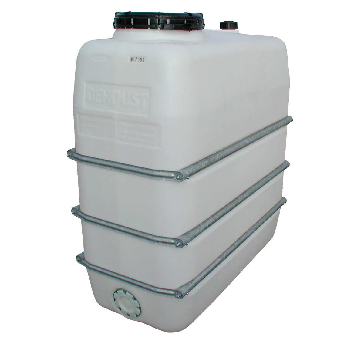 Dehoust vandtanken er en High-Density polyethylen enkeltvægget 1500 liters tank til vand og lign. Materialet er godkendt til drikkevand, og den er monteret med 3 galvaniserede stålbandager.