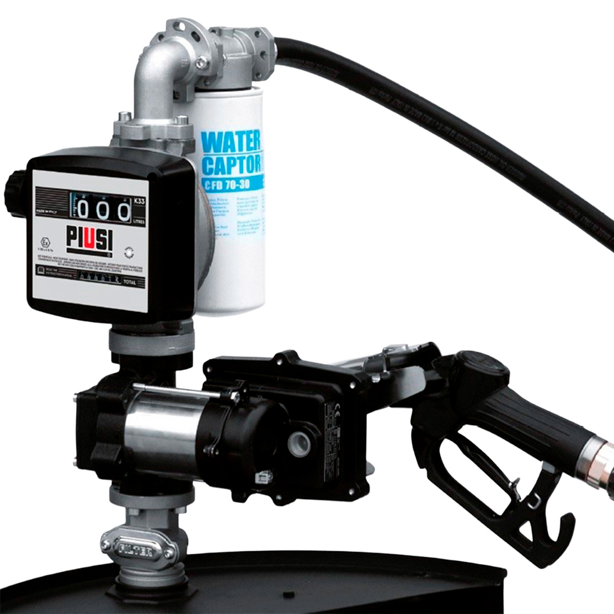 Leveres med A60 Atex automatpistol (21 mm Ø udvendig udløbsdiameter) og 3-cifret tæller. Leveres uden strømkabel. Udstyret med Piusi model EX50 lamelpumpe, 12V/250W DC pumpe, teleskoprør (maks. 1100 mm) og 2" fadforskruning til tromle/IBC montering. Vandseparationsfilter m. konsol medfølger. 4 m 3/4" udløbsslange.