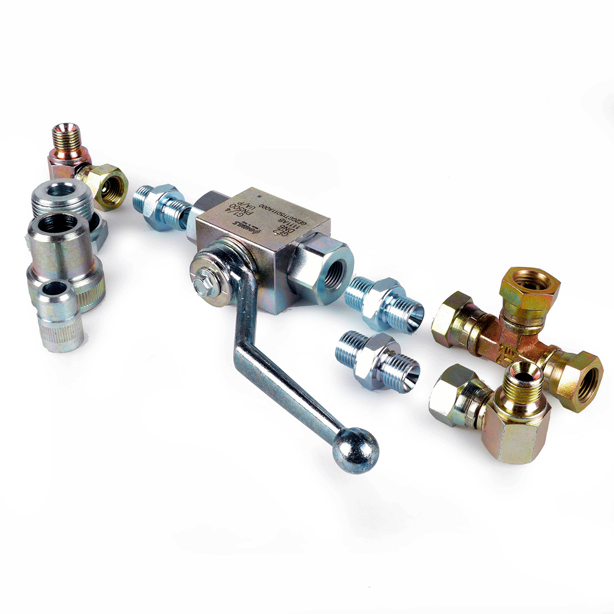 Ombygningssæt til trykluft fedtpumper for alternativ fyldning af fedtpresser eller udløb gennem slange/fedtpistol som normalt leveres usamlet, grundet mange samlingsmuligheder. Kan bruges til både 9,0 og 14,7 mm fyldenipler.