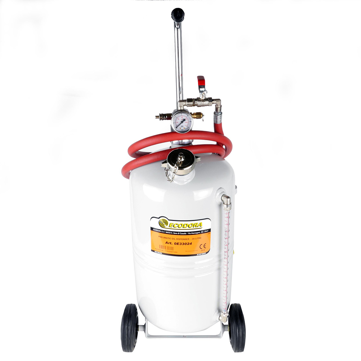 En 24 liters grålakeret oliedispenser til trykluft fra ECODORA med en PIUSI K400 digital oliepistol. Dispenseren er udstyret med 2 hjul og udvendig oliestandsmåler.