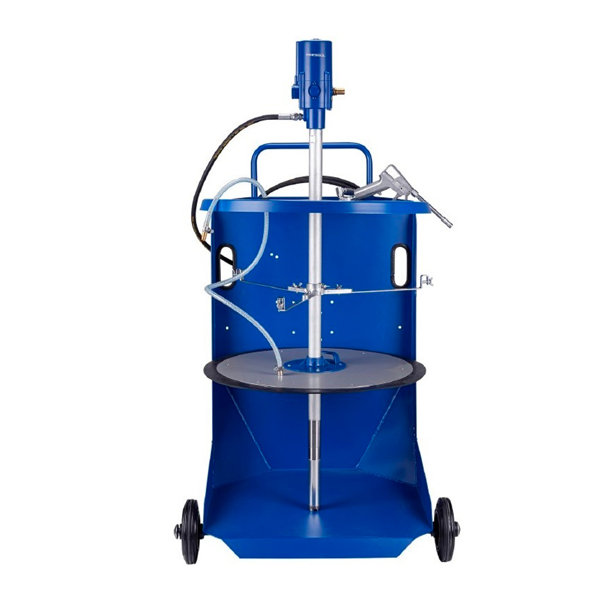 Pressol model 18 786 051, komplet sæt med 50:1 fedtpumpe, 4 meter fedtslange og tilbehør til pumpen (låg, følgeplade med trykluftsløsning og pumpeholder). Sættet indeholder desuden en luksus fedtpistol med Z-drejeled og fast udløbsrør med 4-bakket smøremundstykke. Inkluderet er også en 4 meter slange og en trehjulet, blålakeret (RAL 5010) luksuskærre med aflæggebakke til værktøj samt monteringsplads til slangerulle.