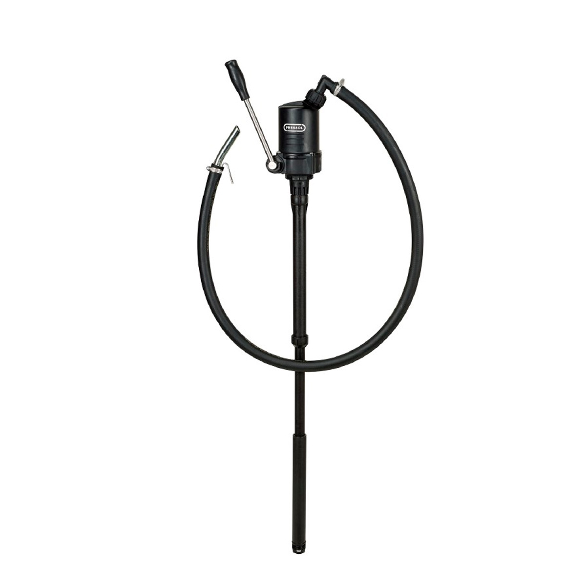 Pressol vrikkepumpe til tromlemontering i 60 og 208 L tromler. Forsynet med 2" (og M 64x4 ) fadforskruning. 3-delt teleskopsugerør af HDPE med Viton® pakninger. Pumpehus af ABS+PA6, pakninger af Viton® og indvendige metaldele af AISI 304 stål. 1500 mm udløbsslange ø19 mm med bøjet udløb i galvaniseret stål. 500 mm stelkabel med klemme. Pumpen er beregnet til specialbrændstoffer, klasse AI-III brændstof (benzin), diesel, fyringsolie, petroleum, olier med lav viskositet op til SAE 50, kølervæske og sprinklervæske (fortyndet eller ufortyndet).
