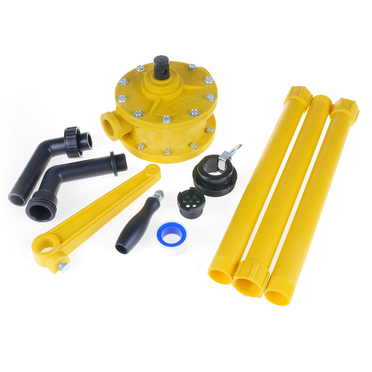 Rotationspumpen er fremstillet af polypropylen med Ryton lameller, rustfrie lamelfjedre og Viton pakninger. Gult pumpehus med sort 2-delt justerbart udløb, der ender i 26 mm slangestuds. 2” fadforskruning. Et 3-delt sugerør af polypropylen med gevind giver nem tilpasning til alle tromlestørrelser. Groft sugefilter medfølger. Rotationspumpen kan køre baglæns (suge igennem udløbet) og kan virke som hævertpumpe. Giver op til 35 l/min.