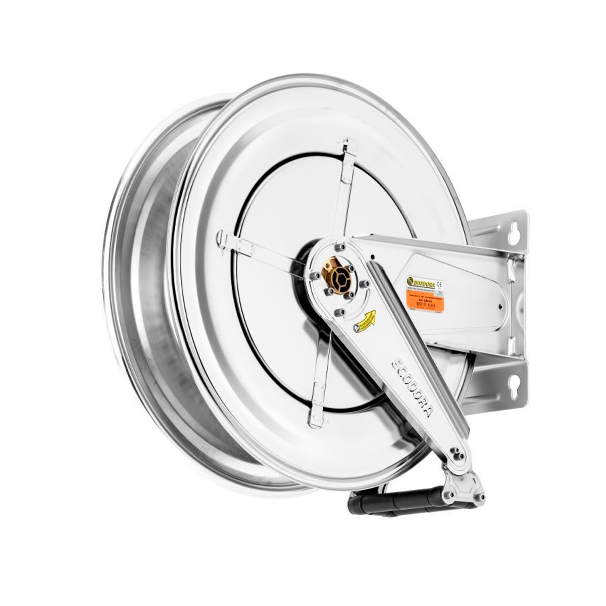Fabrikat: Ecodora. Rustfri (AISI304) slangerulle med plads til 25 m 1/2" slange. Maks. 100 bar. Maks. 130 grader C. Leveres UDEN slange. Centeraksel og drejeled i AISI 304. Drejeled med pakninger af Viton®. Beregnet til vand (koldt eller varmt), kølervæske, sprinklervæske m.m.