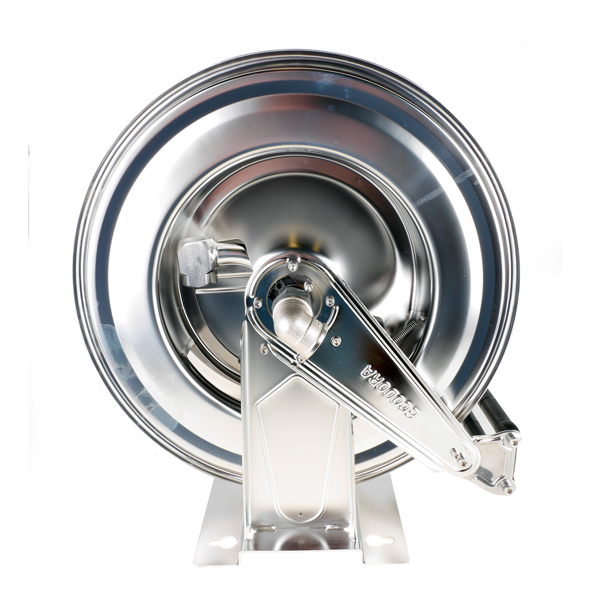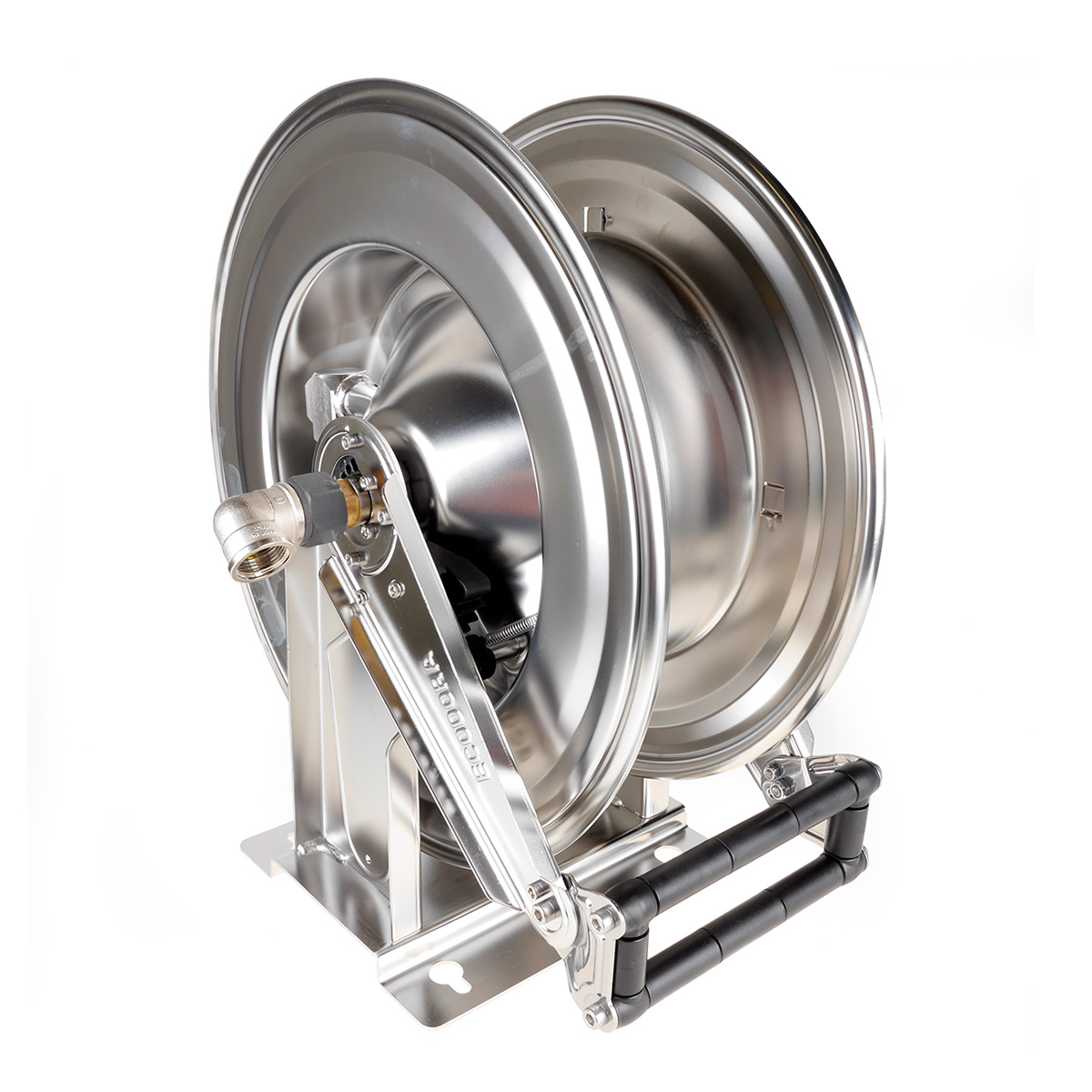 Fabrikat: Ecodora. 1" slangeopruller i rustfrit stål til luft/vand/dieselolie. Leveres uden slange.