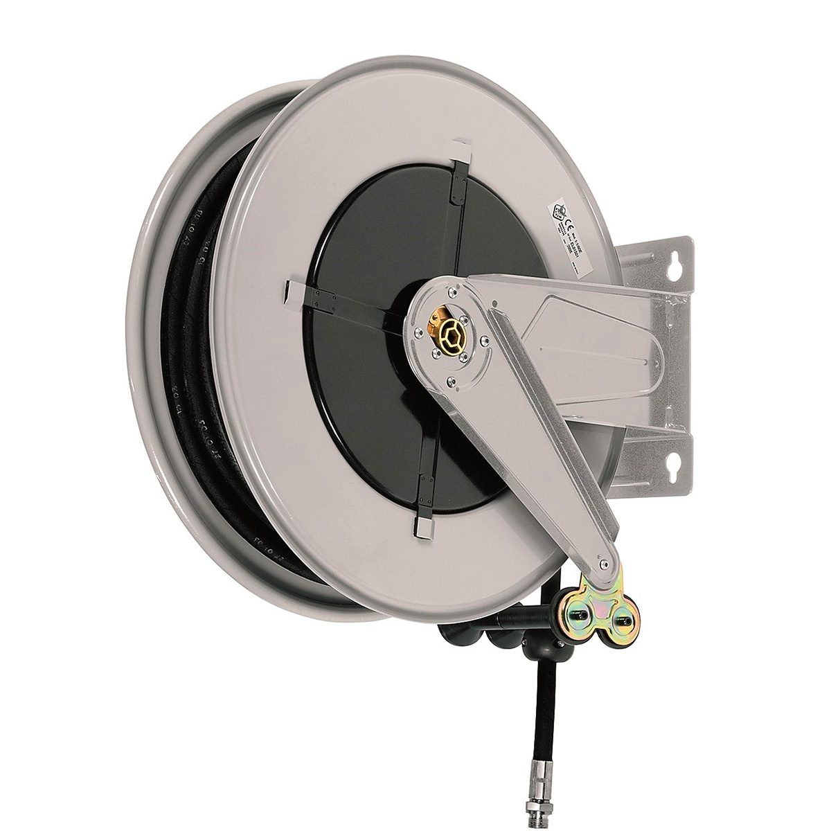 Åben, lakeret helstål slangerulle med justerbar afvikler.