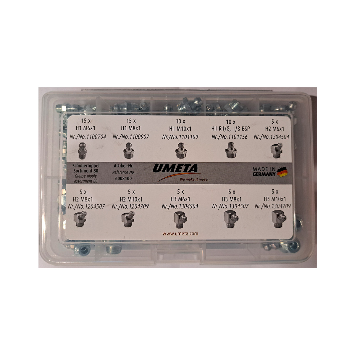 Smørenippel sortiment i plastboks. Indeholder 80 stk. galvaniseret smørenipler af typerne H1/H2/H3 i div. størrelser M6/M8/M10 samt 1/8" RG i tysk topkvalitet fra UMETA..