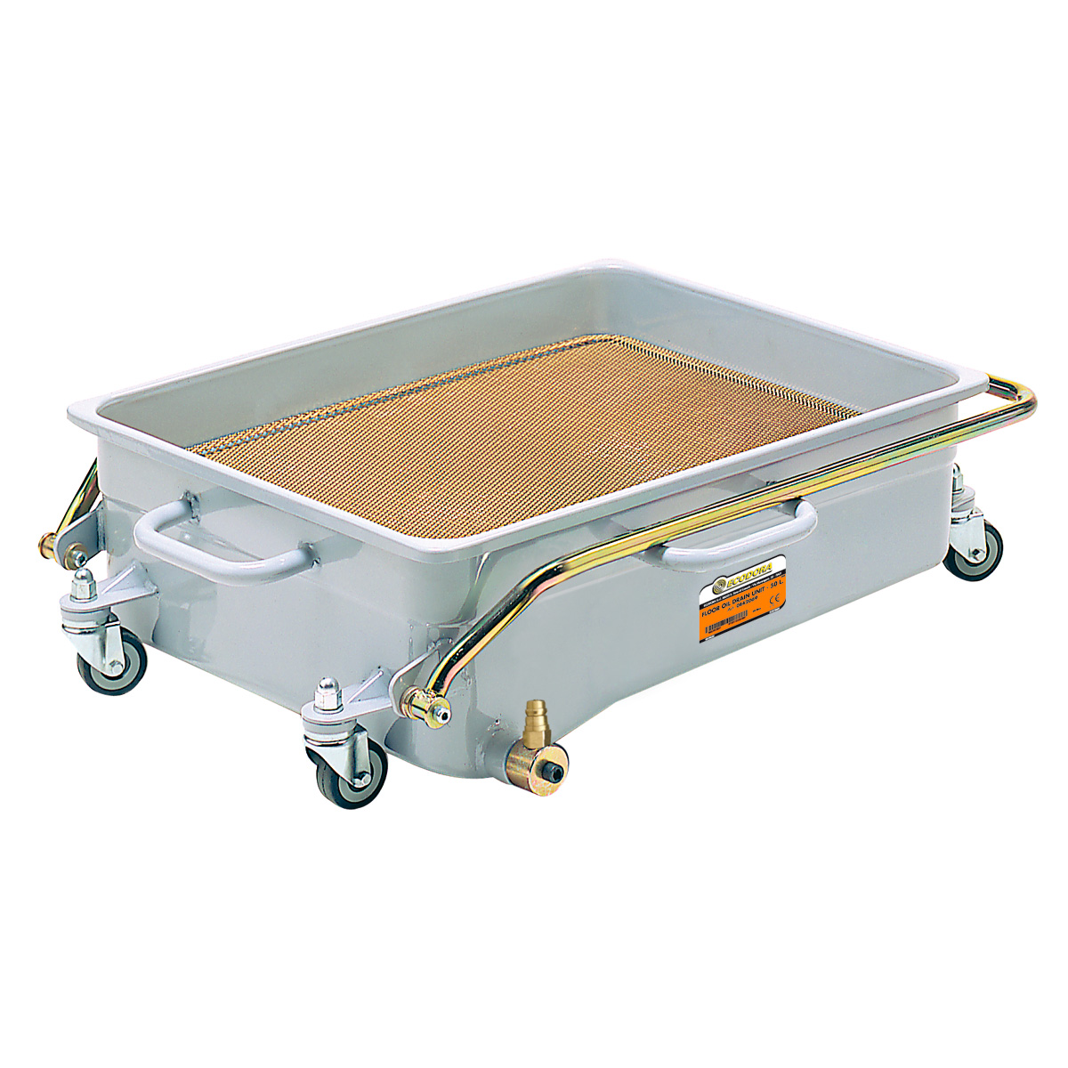 Ecodora flad spildolieopsamler til 50 liter, gulvmodel til underkøring. Udstyret med 4 drejehjul på 80 mm Ø og rist samt antiskvulpe system. Tømmetilslutning med 1/2" URG (løst mundstykke med 2 O-ringe, der stikkes ned i det lodrette sugerør), eller sugerør 22 mm udv. Ø. Nedfældbart håndtag.