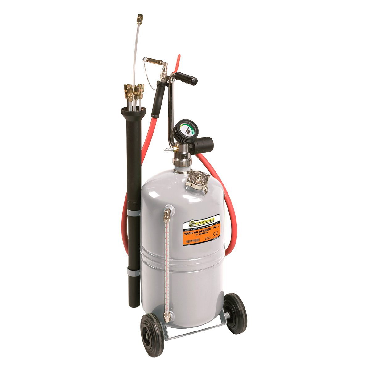 24 L Ecodora er en 2-hjulet spildoliesuger i topkvalitet med udvendig niveaumåler, manometer og 2 meter sugeslange. Den leveres inkl. 6 standard sugesonder (700 ml og 1000 mm længde) samt 3 stk. specialconnectors til BMW, Citroén og VW/Audi.