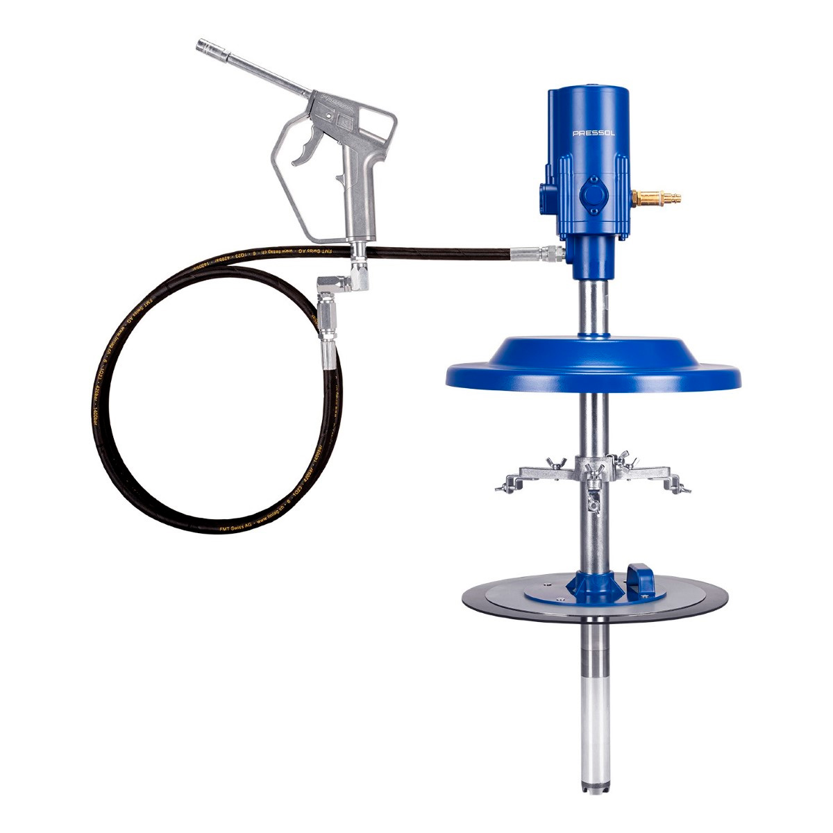 Pressol model 18 419 051 kpl. med 50:1 fedtpumpe, fedtpistol, mont. tilbehør og 2 m højtryks udløbssslange. Pistolen leveres med Z-drejeled. Låget kan nemt løftes for mængdekontrol. På luftindgangssiden er pumpen monteret med trykreduktionsventil, fast indstillet på 8 bar. Vi anbefaler montering af varenummer Y12-1213 trykregulator/vandudskiller/tågesmører for at forlænge pumpens levetid. Systemet leveres usamlet. 600 mm sugerør