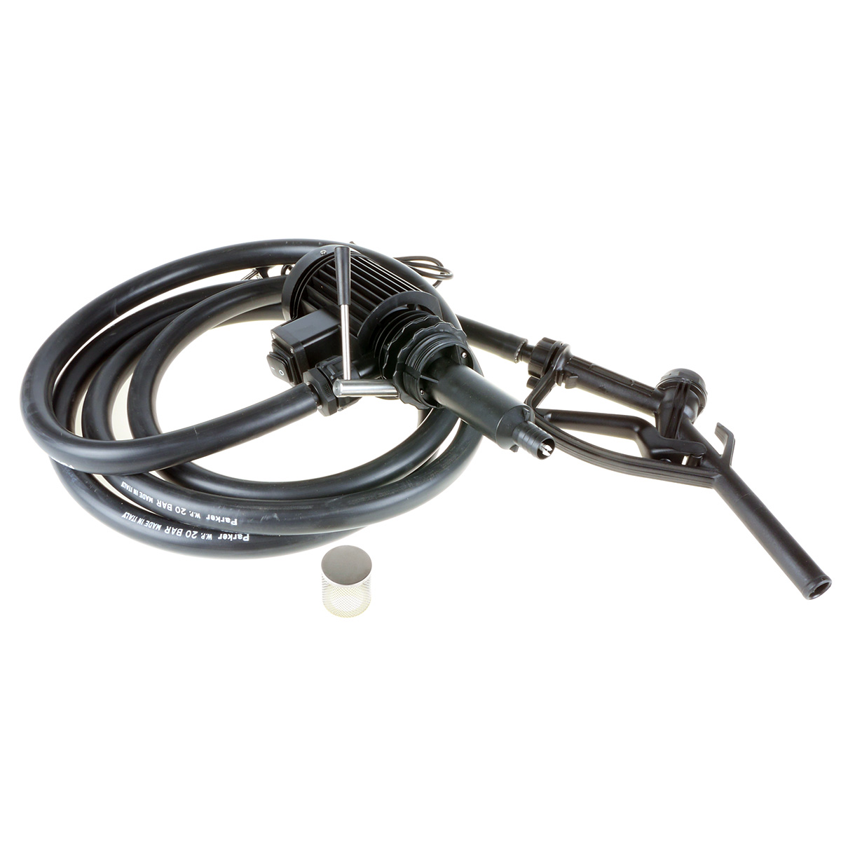 Sættet leveres komplet med suge- og udløbsslange, en manuel udløbspistol og et sugefilter. Kompakt og nem at bruge. Pumpen installeres direkte i tromlen eller tanken.
