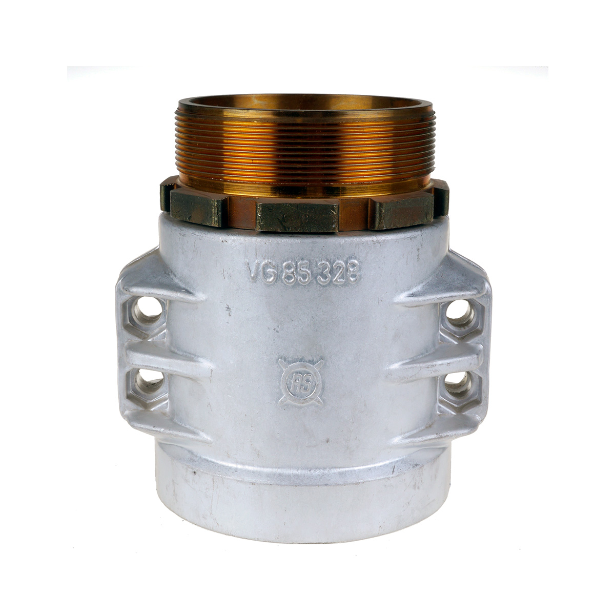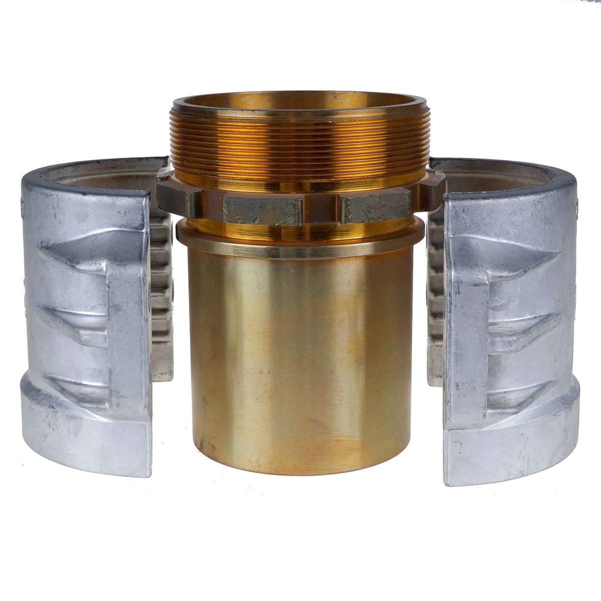 Tankvognskobling med slangestuds og udvendig rørgevind, omkranset af to-delt alu-forskruningskappe. Tankvognskoblingen vælges enten med slangestuds i messing eller rustfrit stål (se varetekst).