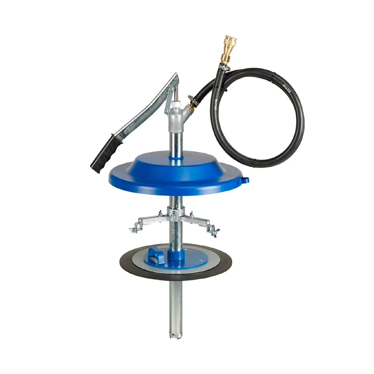 Pressol model 17 012 950 kpl. med fedtpumpe, låg, følgeplade, mont. tilbehør, 1,5 m slange og 1/4" hydraulikkobling (hun) Rectus serie 72. Låget kan nemt løftes for mængdekontrol.