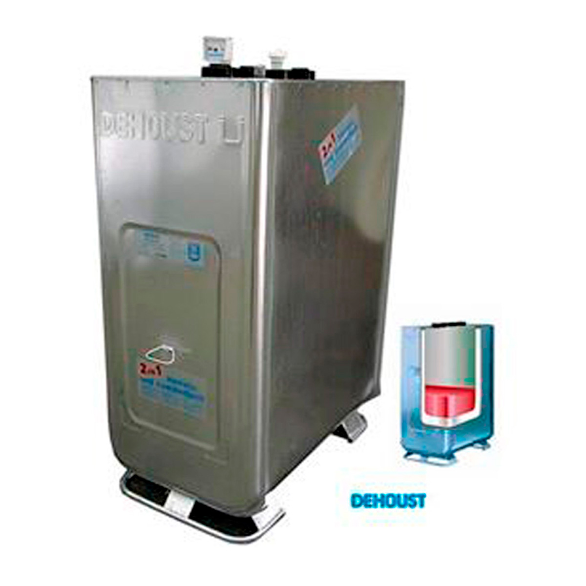 Den er fremstillet af en indvendig beholder af helblæst HDPE og en sammensvejset yderkappe af galvaniseret stål. Tanken leveres med 4 stk. 2” IRG forskruninger i toppen. De 2 optages af den medleverede tankmåler samt udlufter. Optisk lækagealarm er monteret fra fabrik.