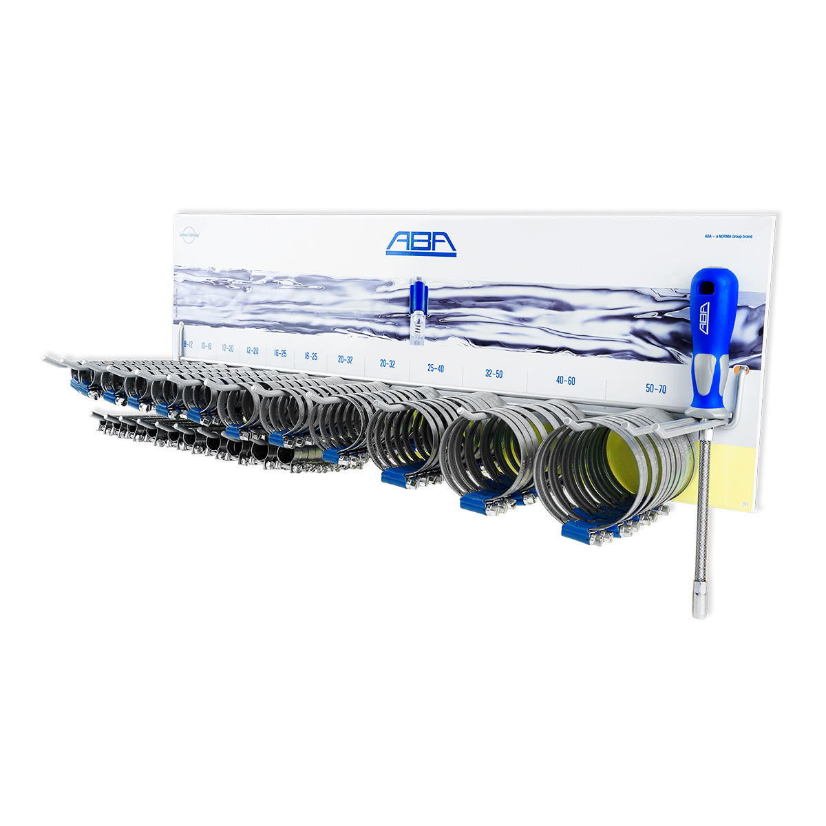 ABA vægstativ med 244 assorterede spændebånd i 9 og 12 mm båndbredde. Inkl. fleksskruetrækker. Mål: 65x15x23,4 cm. Vægt 4,7 kg.