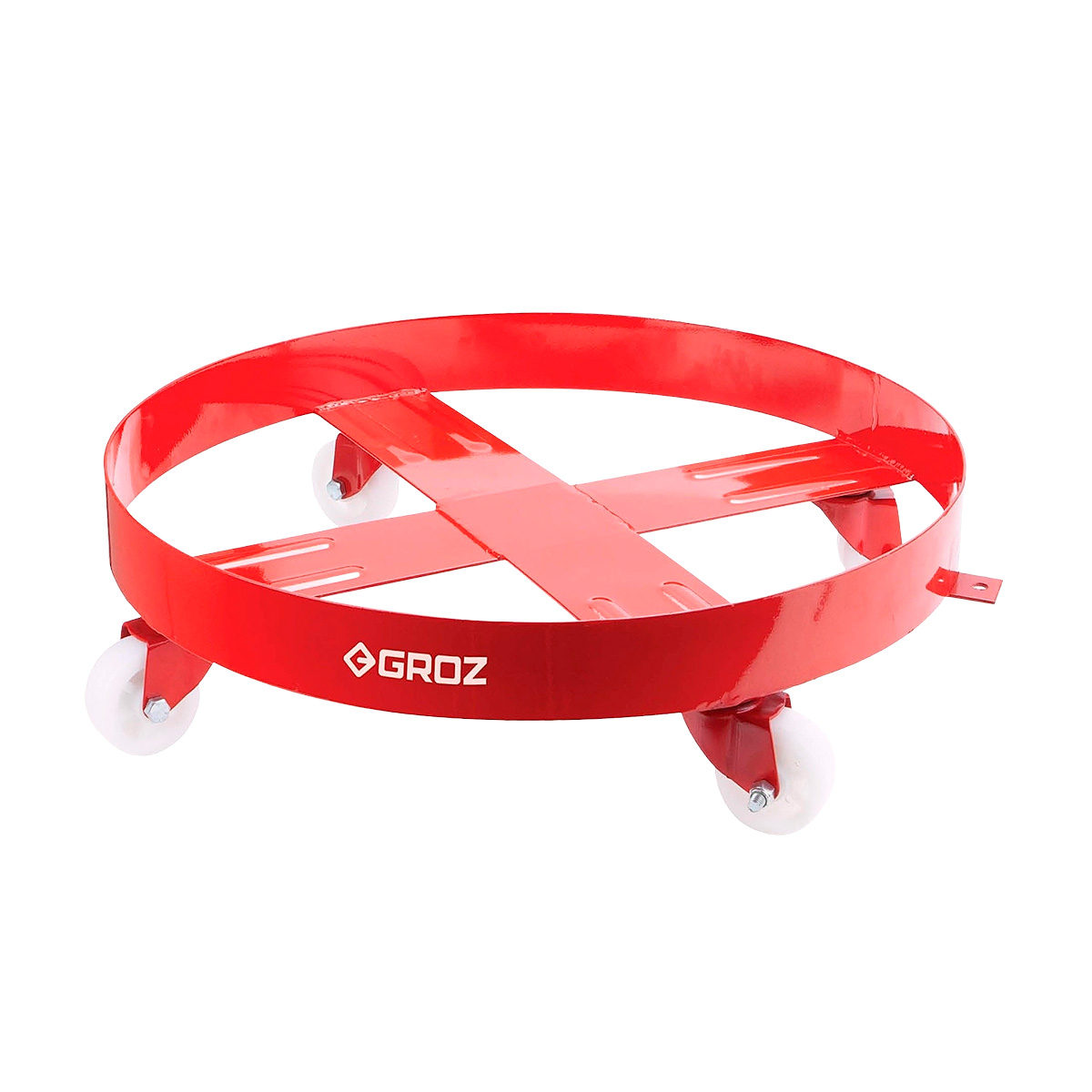 Robust rullebund fra Groz med 4 hjul, designet til sikker og let håndtering af 180 kg/1/1 tromler. Ideel til professionelle miljøer, hvor tunge tromler skal flyttes stabilt og effektivt.